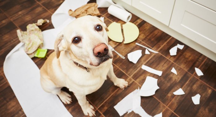 is defined as a dog’s panicked response to being left alone. Symptoms include: destructive behaviour, soiling indoors, continual barking, excessive drooling/panting, attempting to ‘escape’ a room or crate.