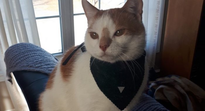 Tanner was skittish in his new home for a few days, but then settled right in. Ryan relates that “initially, we gave him lots of space and let him come to us for the most part.” As for Tanner’s favorite things, Ryan says “Looking out the big window in the living room for hours. Cuddling into mom’s or dad’s neck and wearing the new bandana we bought him for Christmas. And lots of treats!” He now has a baby cat-sister, Temmie, that the couple adopted last fall. “It took some time and patience, but they’re good friends now; we find them playing or curled up together.”