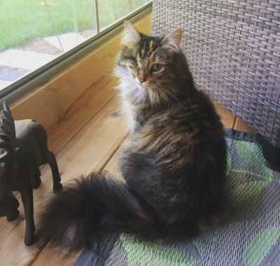 “When I first brought her home she was pretty shy, but she has blossomed into a sassy and loving kitty,” Allison shares.  “One of my favourite stories about her is that she had a relatively short and dull coat when I adopted her, and as soon as she relaxed into her new life and became comfortable eating tons of wet food, she literally exploded with hair!  Much to my surprise and delight, she became a beautiful and fuzzy long-haired cat.”