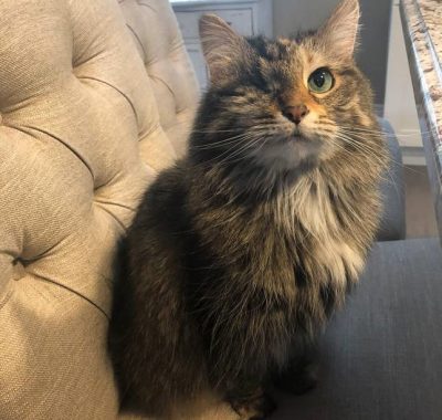 Beauty now lives in Muskoka, Ontario and did surprisingly well flying from Nova Scotia to Ontario.  She enjoys a large house with a screened-in porch that she loves to sit in three seasons of the year and watch the birds go by.  “She doesn’t go outside due to her missing eye and us wanting to keep her safe, but she has adapted remarkably well considering all she went through,” says Allison.  “Even with one eye she still runs around the house, plays with catnip toys, and jumps up on tables… although she’s not supposed to.”