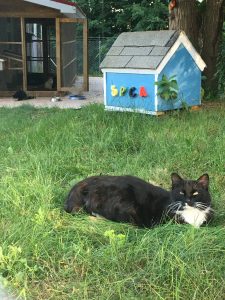 Melissa shares “This summer, we undertook to beautify the Sanctuary. With normal wear and tear, the cat huts definitely needed some TLC. Kevin Foucault, one of our most dedicated volunteers, made needed repairs to the huts’ structures and gave them all a new paint job. He generously donated many hours doing this and it’s now a much brighter, peaceful and loving space thanks to his thoughtfulness.”