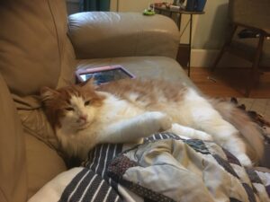 “He likes to sit on me, which I like,” Amber says, “he doesn’t wait for me to finish sitting down before he plunks down on me. Most cats fuss around kneading and looking for the right spot, Bob doesn’t at all- it’s like he doesn’t want to waste any time.”