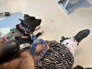 Jodi went into the shelter and told staff what she was looking for. The staff brought out a sweet black and white dog. That is the moment that Jodi met her future service dog, Cash, who had been found as a stray roaming around in Truro.