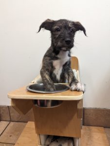 This way, Potato could eat his blended-up food staying upright and gravity could do all the work. Potato was getting the hang of this new way of eating. But while the other pups and mama found loving families, Potato continued to wait and wait. He needed someone very patient and understanding of his needs.
