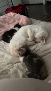 “Once they had their vaccines and had been with me for a while, I allowed them to meet Rocky (also a foster fail haha),” Georgia shared. “Rocky jumped in and was a great big brother, he was constantly grooming them, and he would even pick them up and bring them up on the bed so they could all cuddle together. I had felt Rocky needed a friend, so I made it official and adopted Pip and Posie.”