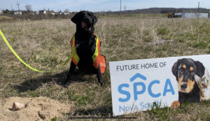 Today, Marsha and her husband Paul have their best buddy black lab Jake at home. “We pretty much take him everywhere,” she says. They always welcome their six grand dogs to join family festivities. In 2022 Jake donned a construction vest and went to work as “lead digger.” when he officially turned over the first bit of dirt to start the construction of the new SPCA for Northern Nova Scotia.