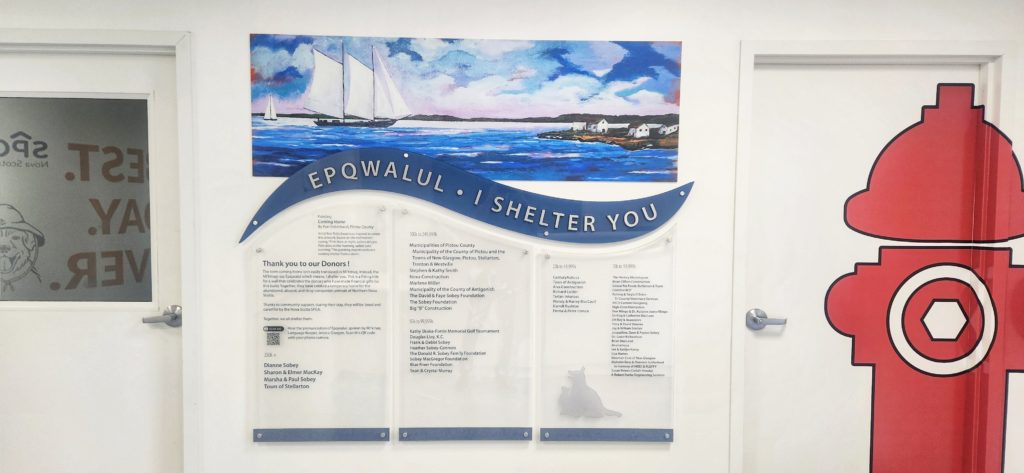 Donor wall with centrepiece painted by local artist Ron Robichaud. The painting is called Coming Home, which can’t be translated into Mi’kmaq. A Language Keeper told us that you can say I shelter you.