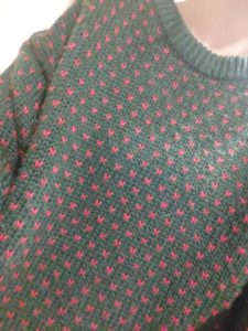 My favourite piece of clothing is an emerald sweater with tiny red hearts all over it.