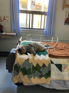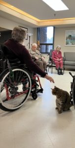 Poppy’s daily routine starts with greeting the nursing staff as they arrive in the morning and perching on the desk while they prepare for their shift. She spends her days laying in her favourite resting spots on recliner chairs and soft blankets in resident rooms, as well as sunbathing in our unit’s solarium. She enjoys greeting staff, residents and visitors as they enter the unit.