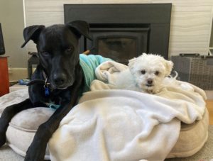 Frank has blossomed in so many ways since being adopted, explained Laura. “When we first brought Frank home, he was skittish around new people, kept his tail tucked between his legs and held his head low. Now, he greets new people with a wagging tail and bright eyes, he takes every opportunity to play with dogs that pass him on the sidewalk, and prances around with his head and tail held high. Interestingly, while Frank originally preferred to be the only pet at home, I actually think he would now love a dog friend at home, and we will likely adopt Frank a friend from the SPCA! We had such a great experience adopting, I can’t imagine doing it any other way now. Frank is the epitome of a social butterfly, he will play with any dog that is willing, and he even curls up regularly for naps with Iain’s parents 7-lb. dog Roxy.”