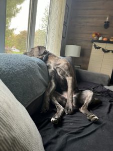 Now Lucy spends her days discovering new activities to enjoy. Sage told us some of, “her favourite ones are playing outside in the yard with her soccer ball, chasing the laser pointer at night, cuddling her favourite people on the couch, sitting like a human looking out the living room window, walking and car rides and getting lots of treats.”