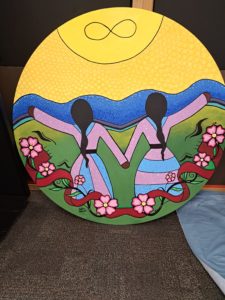 Looking up at her dancing, there is a dog and a cat. Animals have their own ceremonies, so they are not dancing in the art, but animals are important in Indigenous art, and the SPCA helps heal a lot of cats and dogs, so it was important to include them.